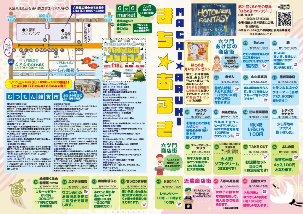 2026年1月17日(土)・18日(日)久留米ほとめき通り商店街『1月のまち歩き』 / まち歩き / By machigenki 2026年1月17日(土)・18(日)※2日間 雑貨 de アーケード @ 一番街商店街 むつもん雑貨市 @ 六ツ門あけぼの商店街 6×6 market @ 六ツ門商店街 チラシのPDFはこちら
