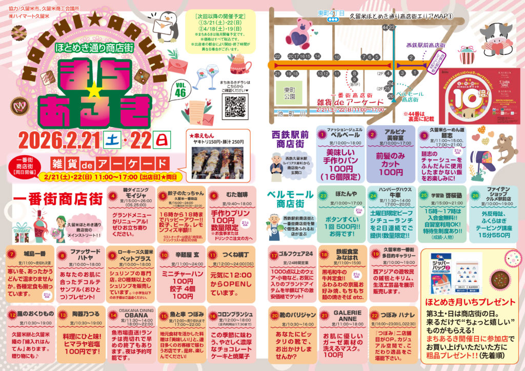 2026年2月21日(土)・22日(日)久留米ほとめき通り商店街『2月のまち歩き』 / まち歩き / By machigenki 2026年2月21日(土)・22(日)※2日間 雑貨 de アーケード @ 一番街商店街 むつもん雑貨市 @ 六ツ門あけぼの商店街 6×6 market @ 六ツ門商店街 チラシのPDFはこちら